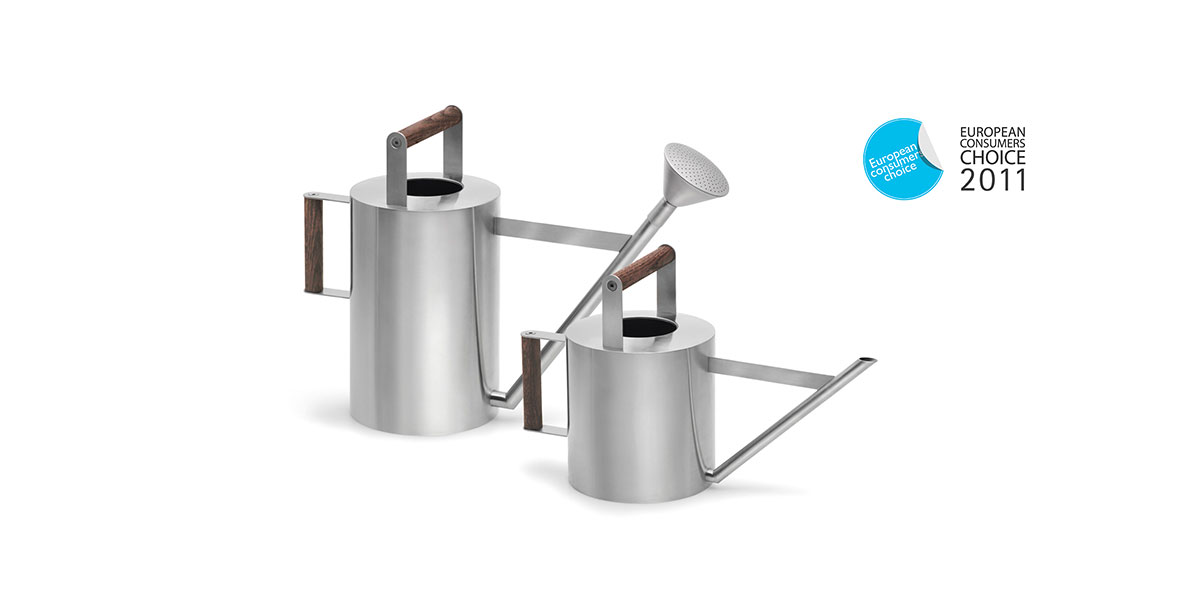 Die zeitlose Edelstahl-Gießkanne und mit zwei Holzgriffen